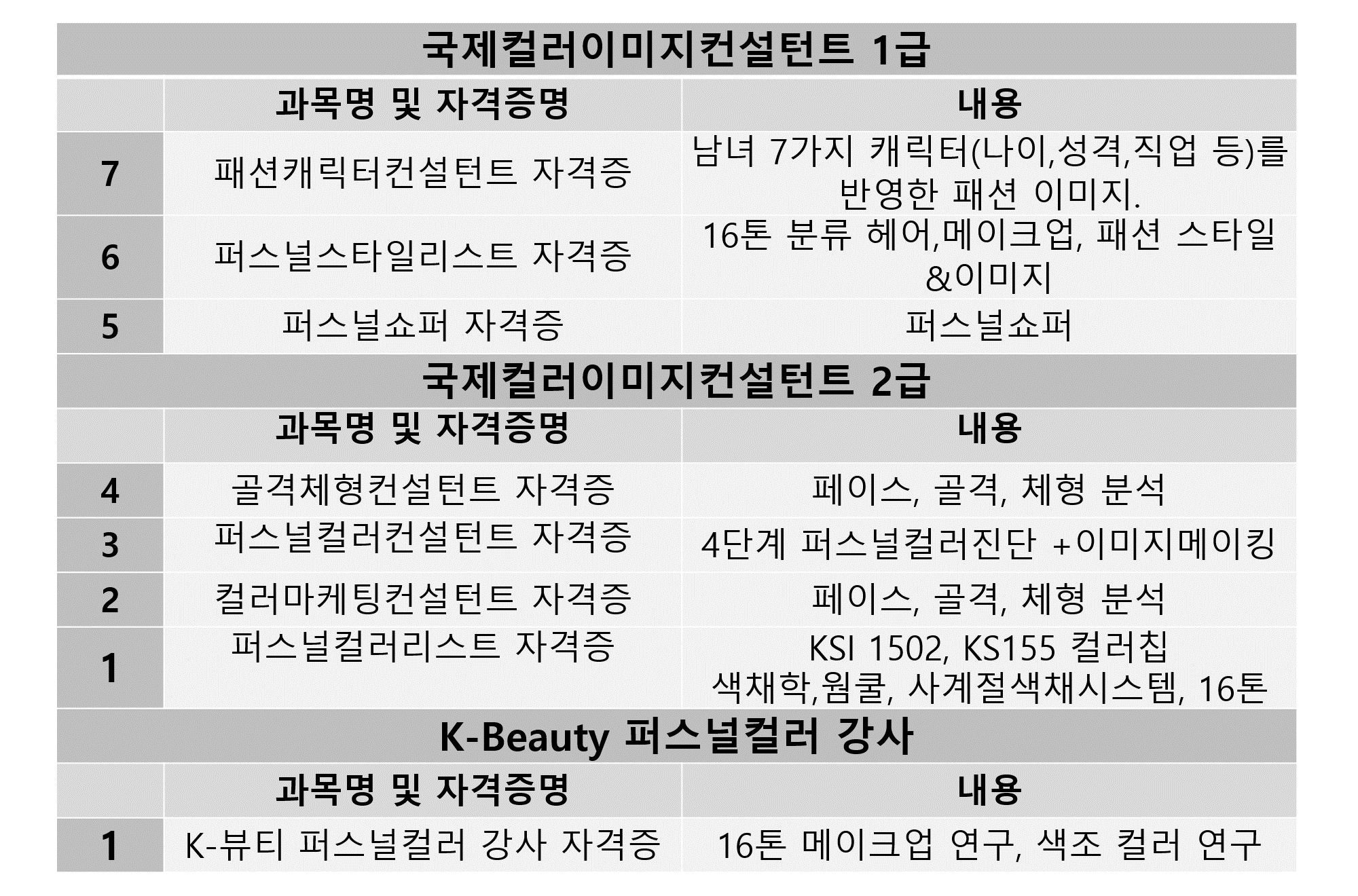 전문가양성 전문가양성과정 국제컬러이미지컨설턴트 1. 전문가양성과정 학생, 이직 혹은 컬러이미지컨설턴트로 활동하고자 분들이 배워 전문가가 되는 국제컬러이미지컨설턴트 양성 과정 *활동영역*퍼스널컬러 컨설턴트K-뷰티 퍼스널컬러강사퍼스널컬러진단 샵 CEO대학출강, 화장품 회사 취업 등 2. 과정 전문컨설턴트 | 국제컬러이미지컨설턴트 1급 기본컨설턴트 | 국제컬러이미지컨설턴트 2급 외국인대상 | K-Beauty 퍼스널컬러 강사 3. 자격증 자격증 Ⅰ. 국제컬러이미지컨설턴트1급Ⅱ. 국제컬러이미지컨설턴트2급Ⅲ. 퍼스널컬러리스트Ⅳ. 퍼스널컬러컨설턴트Ⅴ. 퍼스널스타일리스트Ⅵ. 패션캐릭터컨설턴트Ⅶ. 컬러마케팅컨설턴트Ⅷ. 골격체형컨설턴트Ⅸ. 퍼스널쇼퍼Ⅹ. K-Beauty 퍼스널컬러 강사*국제컬러이미지컨설턴트1급 과정을 취득하시는 분은 추가 9개 자격증 동시 취득.(자격증 발행비는 별도) 4. 교육 프로그램 교육프로그램 5. 대상 국제컬러이미지컨설턴트가 되고자 하는 일반인 6. 비용 비용 국제컬러이미지컨설턴트 1급 : 240만원 (10주X3H=30H)(패션캐릭터, 패션심리, 퍼스널쇼퍼 등 패션 이미지를 심도 있게 배우는 과정) 국제컬러이미지컨설턴트 2급 : 380만원 (16주X3H=48H)(KS색채학의 모든것, 퍼스널컬러 모든것, 색채 및 색조 헤어,메이크업,패션 퍼스널컬러 스타일링 이미지메이킹 모든 것을 배우는 과정) K-Beauty 퍼스널컬러강사 : 280만원 (4주X5H=20H)(퍼스널컬러진단, 16톤 색조 분류, 16톤 메이크업 패턴 연구, 메이크업 컨설팅(브랜드 분류)을 배우는 과정)
